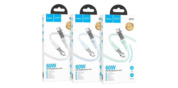 U111 Transparent Discovery Edition, Type-C to Type-C charging data cable, 1.2m, transparent plastic and two-color braid, supports 60W (20V / 3A) for laptops and 3A for mobile phones.